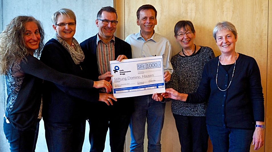 Den Erlös aus dem traditionellen Verkauf von Kuchen und Strickwaren stiftet der Katholische Frauenverein Brugg KFV jedes Jahr einer Institution, die sich für Menschen einsetzt und sie im besten Sinne unterstützt und fördert. Dieses Jahr kann der Vorstand 1000 Franken an die Stiftung Domino in Hausen überweisen. „Damit können wir unseren Klienten etwas Ausserordentliches gönnen, was das Budget nicht oder nur teilweise abdeckt“, freuen sich Geschäftsführer Rainer Hartmann (links) und Markus Bopp, Bereichsleiter Arbeiten, anlässlich der Checkübergabe. Konkret wird die Spende in den nächsten Betriebsausflug investiert. Die Stiftung Domino bietet heute über 150 Menschen mit Beeinträchtigungen geschützte Arbeitsplätze, an denen sie sinnvolle Arbeiten vor allem für die Industrie erledigen, sowie passende Wohnmöglichkeiten.